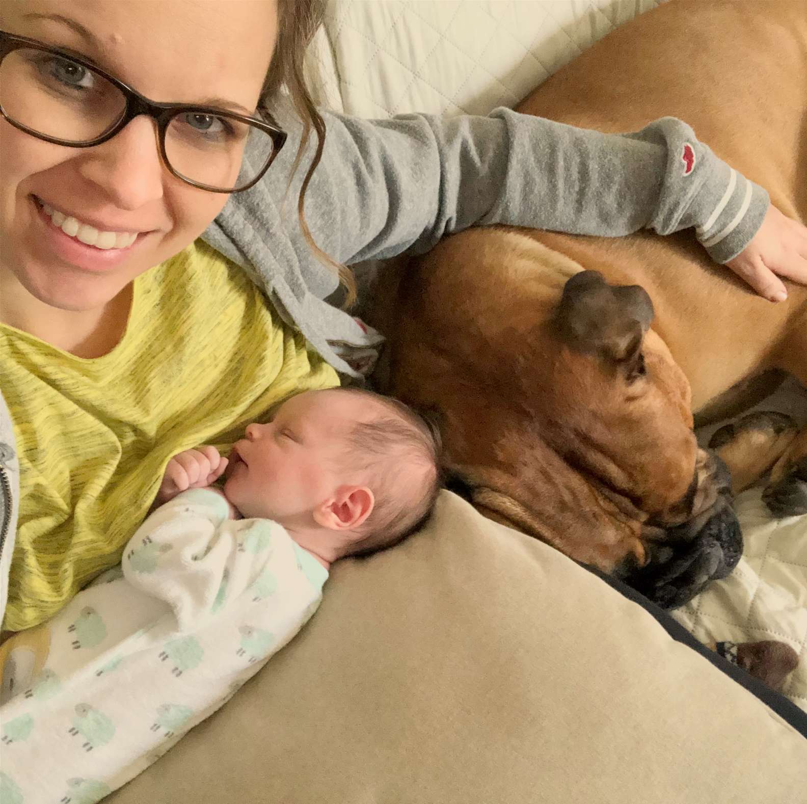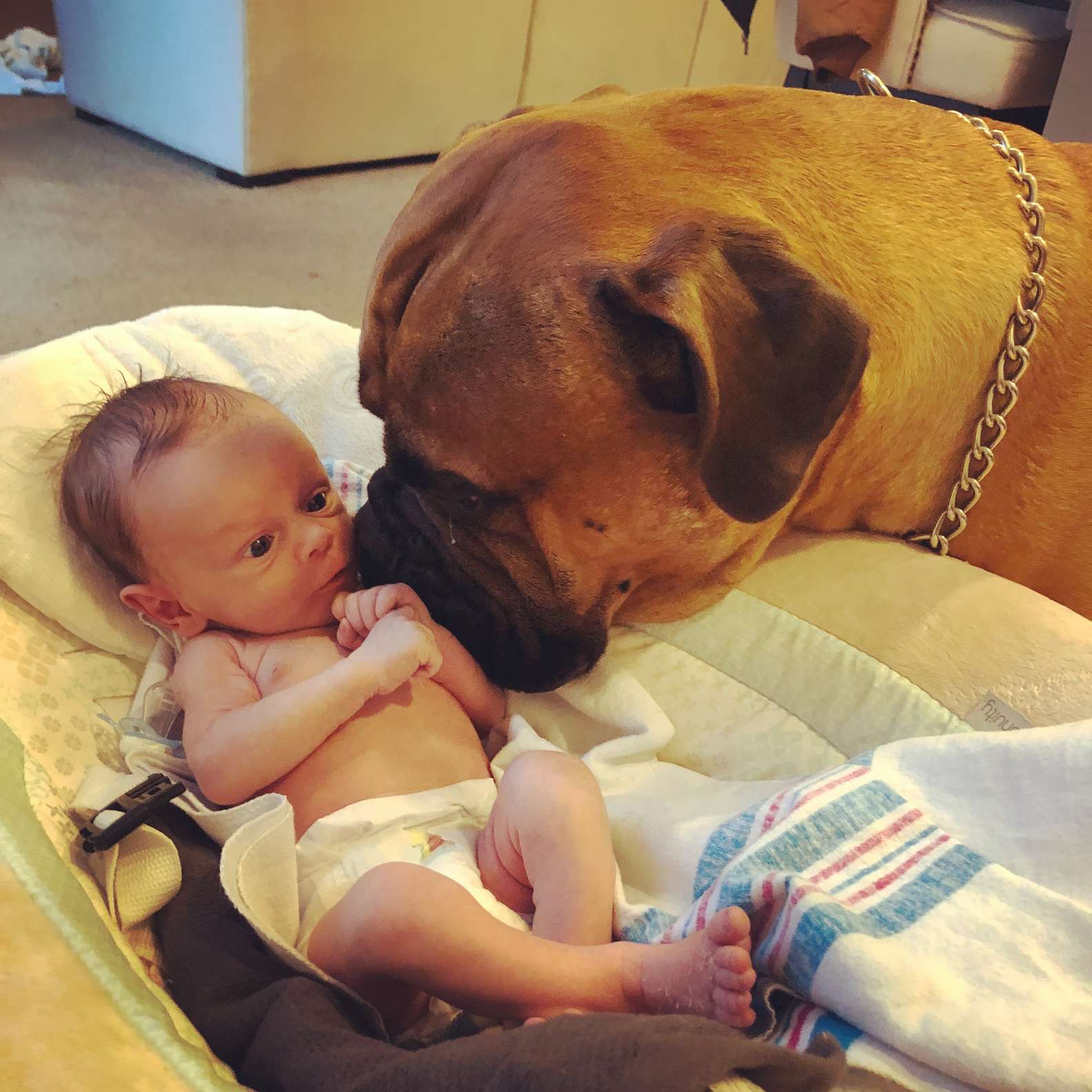 “I made sure to pay some attention to him,” Michalek said. Then she let Brutus come in and meet the baby. “Brutus completely bypassed my husband to meet Kayden. He immediately wanted to give him kisses and snuggle up to him.”