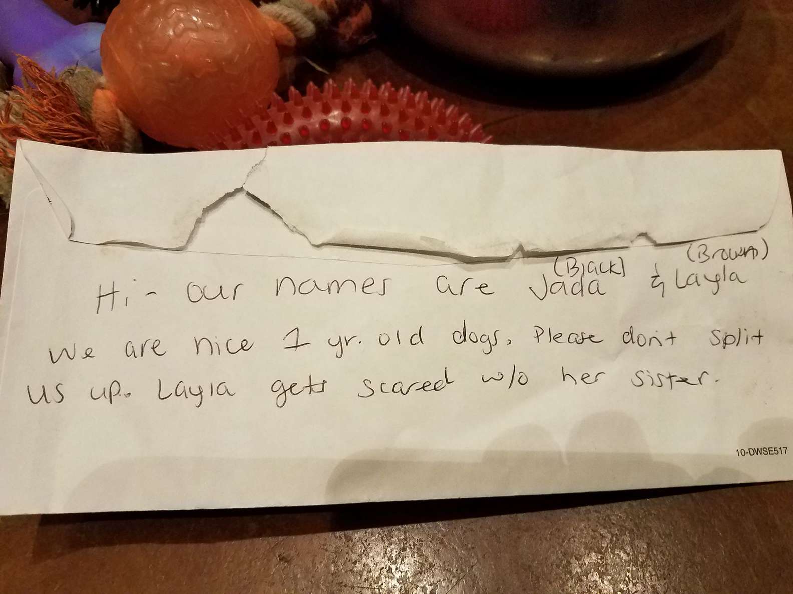 “Our names are Jada (black) and Layla (brown),” the note said. “We are nice 1-year-old dogs. Please don’t split us up. Layla gets scared without her sister.”